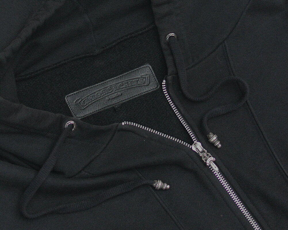 フロント下部には、CHプラスのレザーパッチとシルバーのスクロールロゴ、ジッパーにはダガージッパーを使用。