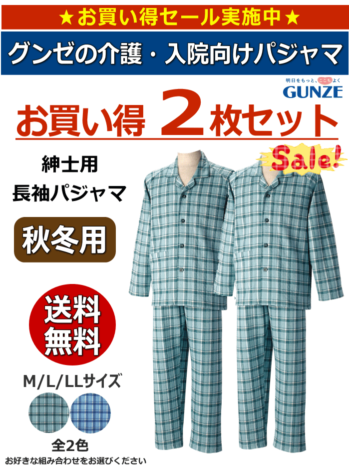 メーカー グンゼ サイズ表 (cm) M L LL 身丈 72 75 75 身巾 57 59 63 袖丈 73 76.5 76.5 パンツ丈 100 106 106 股下 69.5 74 74.5 胸囲 88-96 96-104 104-112 身長 165-175 175-185 175-185 ウエスト 76-84 84-94 94-104 介護パジャマ/入院/パジャマ/高齢者/男性/メンズ/シニア/前開き/介護用品/寝巻/入院/入所/病院/施設/手術/術後/着替え/男性用/紳士用/着替え/寝間着/ねまき/お買い得/セール品/ 【2枚セット】グンゼ 長袖パジャマ 紳士 秋冬用 M/L/LLサイズ SB2747 商品サイズ